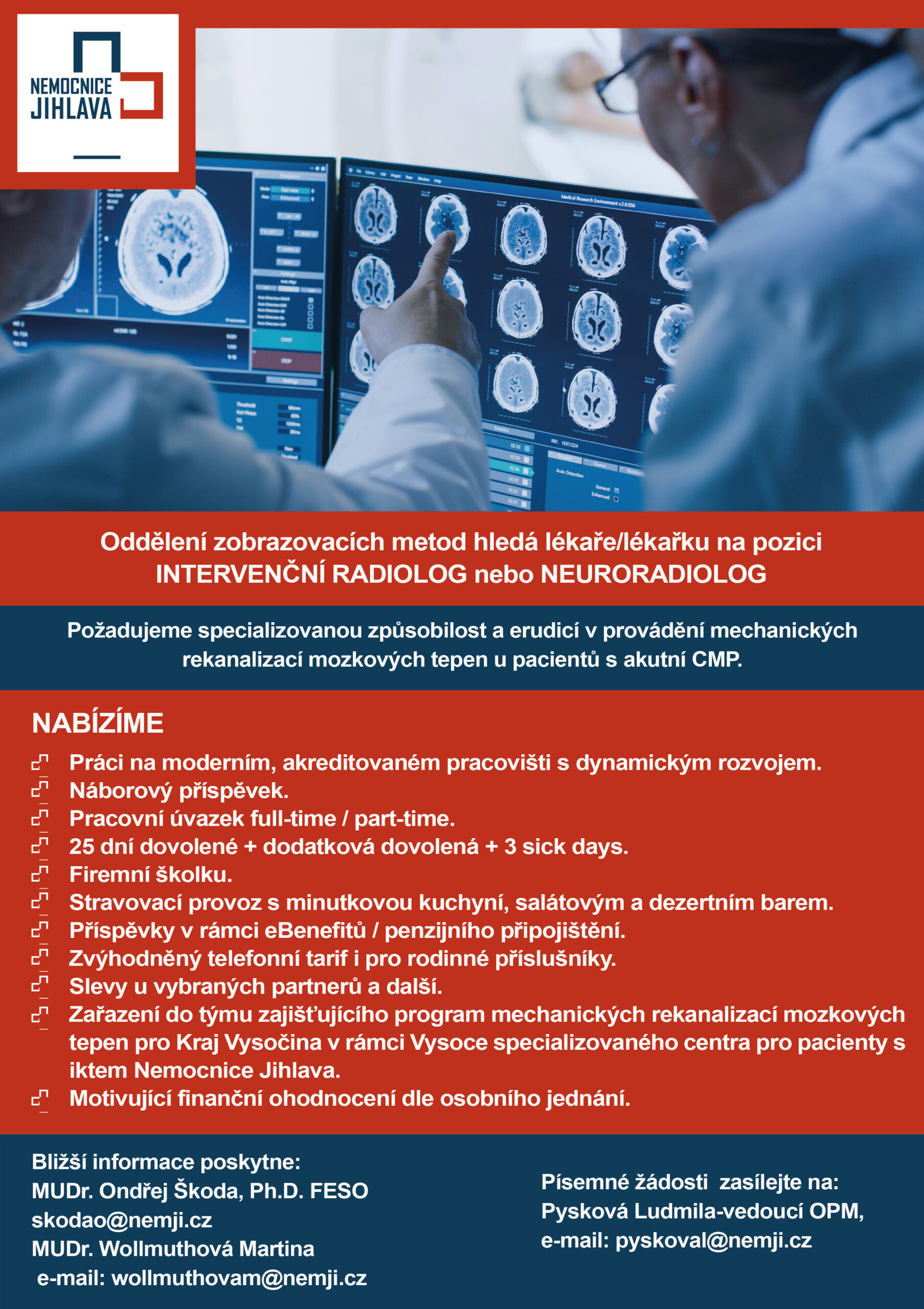 Nemocnice Jihlava hledá na oddělení zobrazovacích metod lékaře/lékařku na pozici INTERVENČNÍ RADIOLOG nebo NEURORADIOLOG