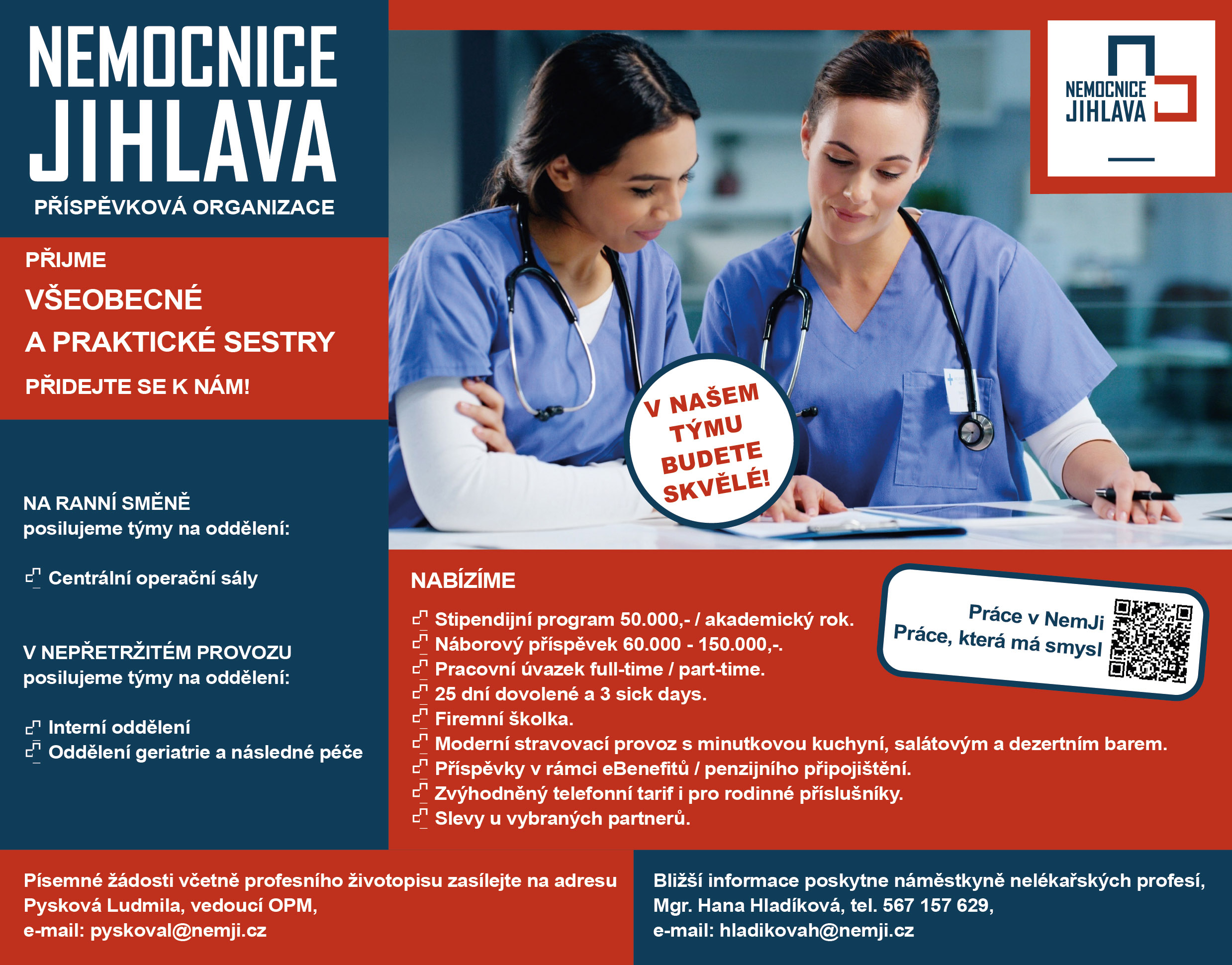 Nemocnice Jihlava přijme VŠEOBECNÉ A PRAKTICKÉ SESTRY