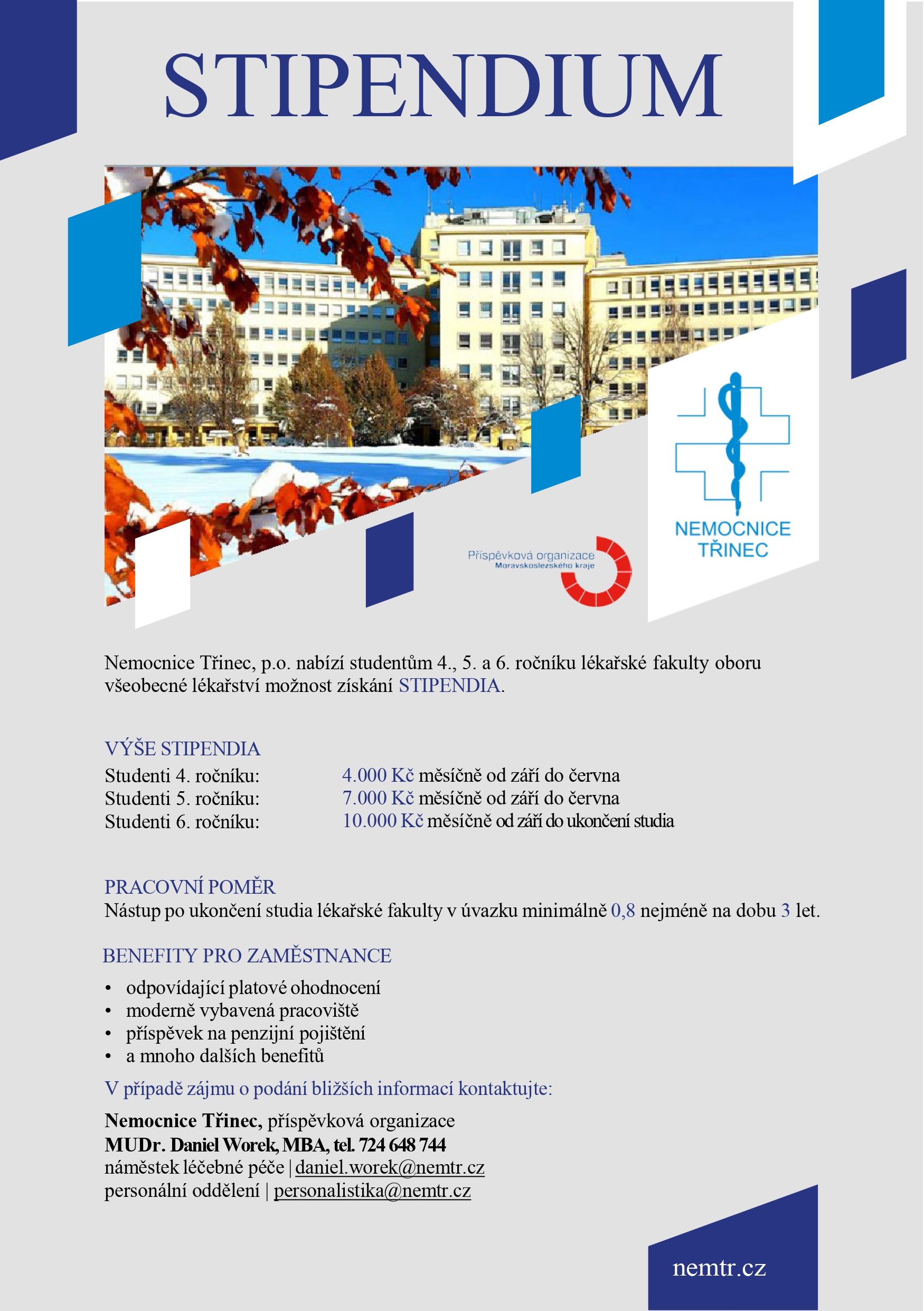 • Nemocnice Třinec nabízí studentům 4., 5. a 6. ročníku lékařské fakulty oboru všeobecné lékařství možnost získání stipendia